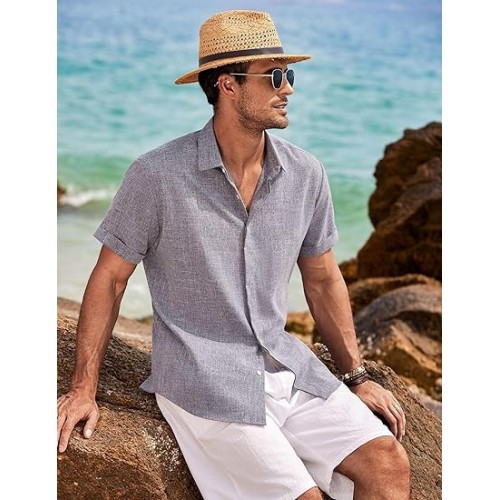 - CASUAL & FASHION --- Mens Casual Linen Shirts comes with button-down closure, short sleeve, adjustable cuff, silm fit, solid color. Casual Beach Style Design to make you feel better about this summer
